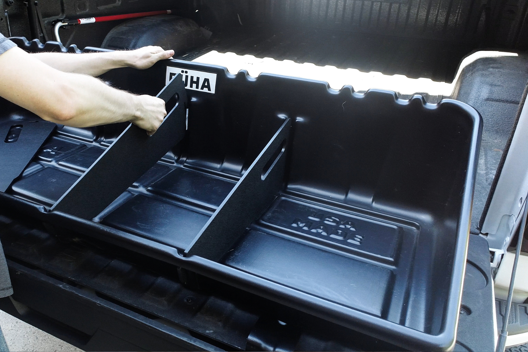 Here at DÜHA, we focus on solving solutions and enhancing the experience of being a truck owner. There are few different products on the market that stop product from sliding to the front of the truck bed, but we found ourselves scratching our heads as many of them were difficult and awkward to install or a hassle to remove when you wanted the whole truck bed. We decided we wanted a large storage space right at the back of the truck bed, but one that you could slide in and out of the truck bed without having to secure it down with straps, cargo bars, and bungees. Let the design of a truck be what keeps our unit in place and when you want to remove it, it is as simple as grabbing the CargoStop™ and setting it aside.