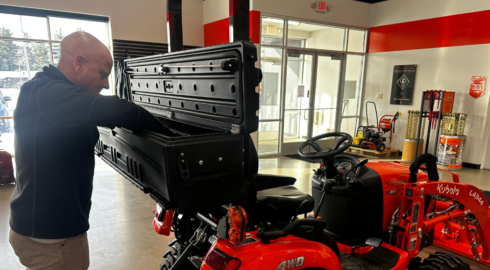 No problem, our ROPS Tractor Mounted toolbox can easily be removed simply by unscrewing easy grip fasteners on the inside of the toolbox, and just like that, you can remove the unit.